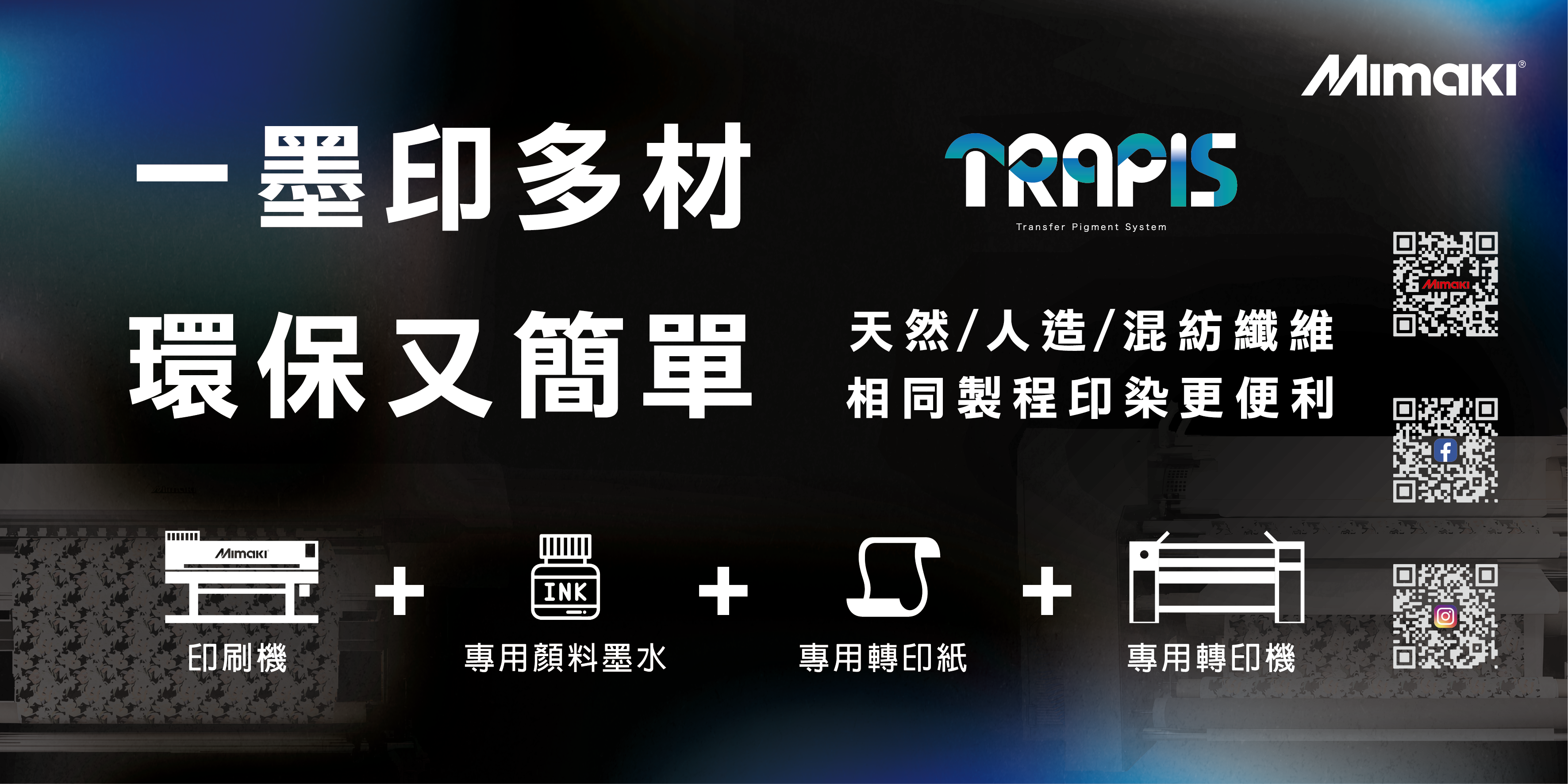 全新印染技術TRAPIS,僅需印刷機及轉印機即可對多數材質纖維進行印染。