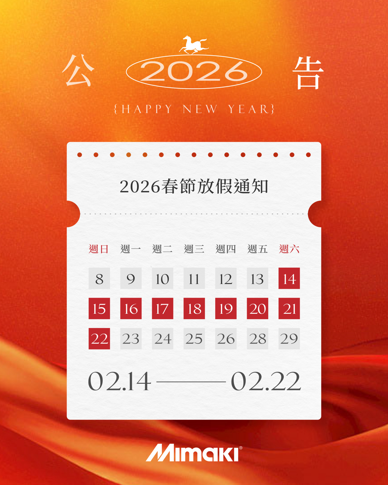 2026年02月02日 通知 感謝廣大客戶長期以來對台灣御牧的支持與愛護, 新的一年,預祝大家馬年行大運。 2026年2月14日(六)~2月22日(日) 適逢農曆春節假期,特此公告。 為了不延誤各業務上的對應, 若有需要訂購零件、墨水、耗材或其他業務上的詢問, 請於2026/2/13(五)18:00前來電洽詢, 若能提前告知,我們將盡早處理。 不便之處敬請見諒,不勝感激。 台灣御牧股份有限公司 全體員工敬上 別錯過任何精彩消息!