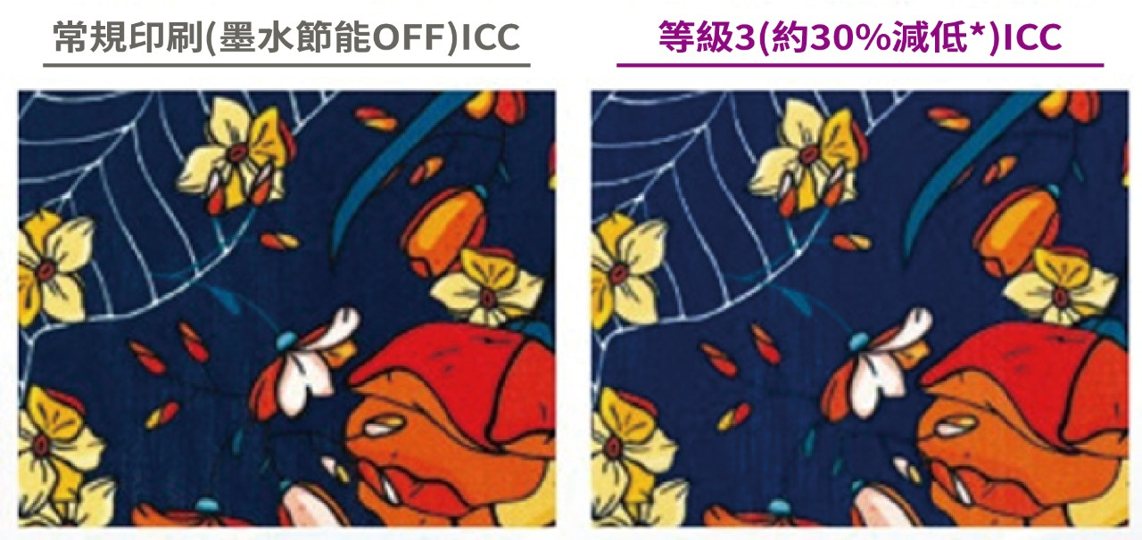 本機搭載像素自動調整機能(DAS1 : Dot Adjustment System 1),初次使用熱昇華轉印機的使用者也能獲得穩定性和高品質(圖4)。另外,本機作為具備「墨水節約功能」的機型,就算沒有專門的顏色調整知識,只要輕鬆點按2下按鍵,就能保持色彩平衡同時減少墨水的消耗量(圖5)。