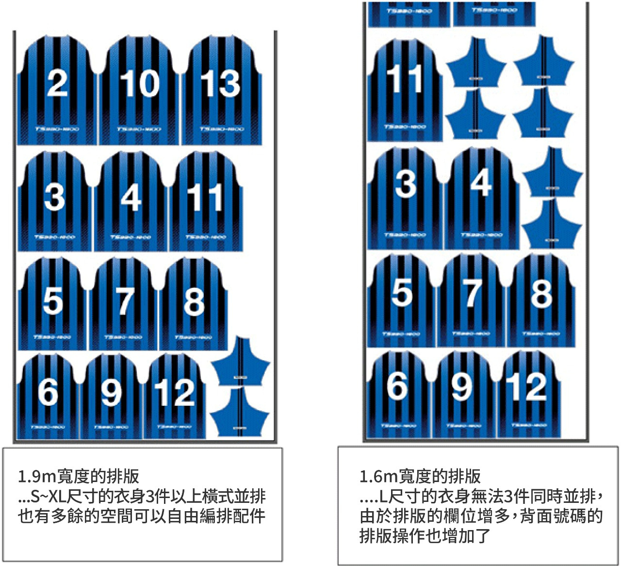‧運動專用服飾用途:團隊制服的製作,可支援多種尺寸(S~XL)裁片橫向併排,將排版效率最大化,自由度也向上提升。此外,衣服背面的號碼或選手的名稱也能流暢地進行排版工程。(圖1)